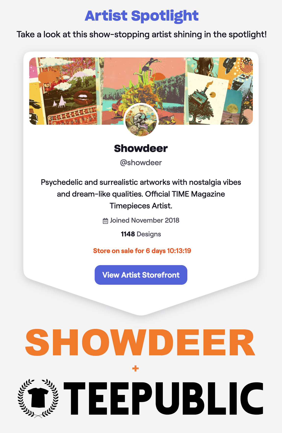 Excited to share I am featured on merch site Teepublic’s front page as the Artist Spotlight for an entire week! My whole shop will be on sale during this time where you can pick up t-shirts, prints, etc! View my shop HERE!